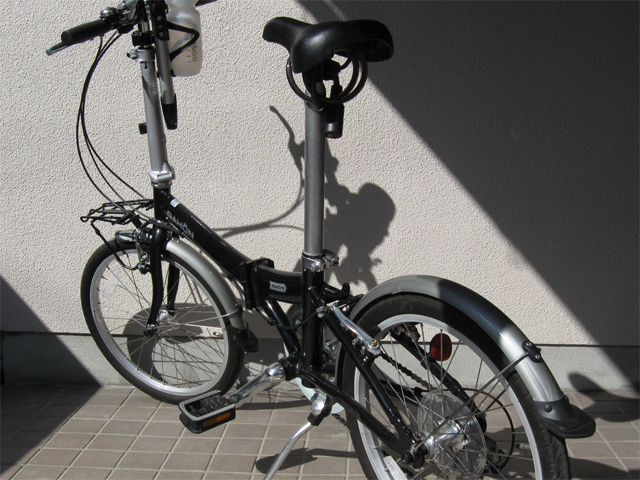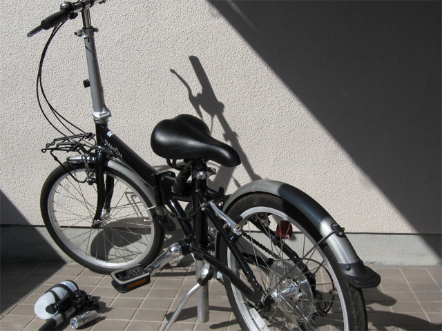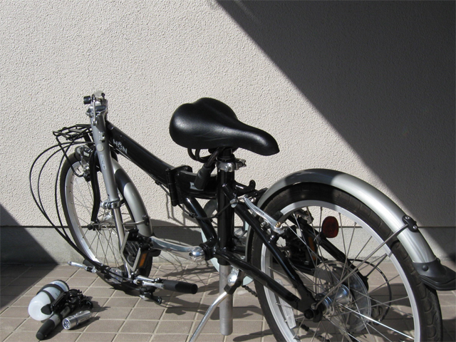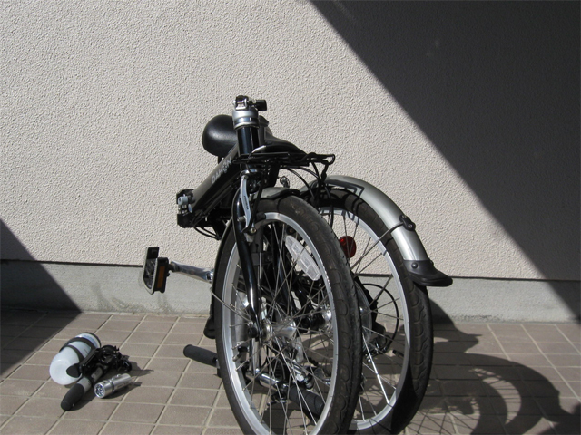 ハンドルをできるだけ長くして折り曲げたあと、ペダルをたたみます。