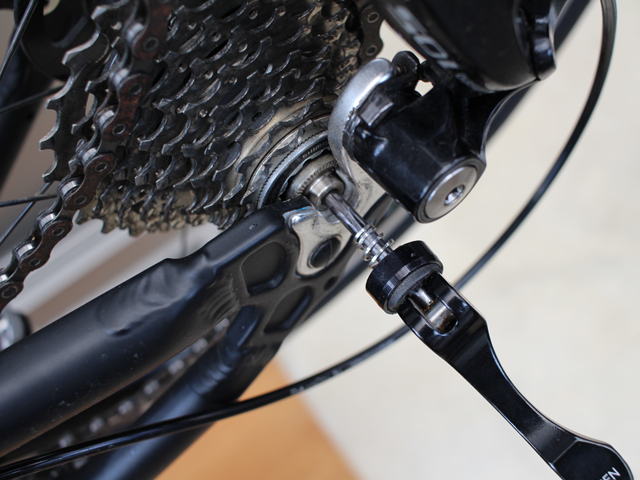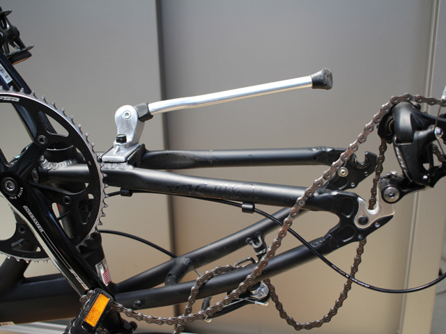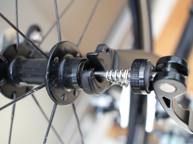 | 軸を固定させます。 この自転車はレンチがいらないので、とても簡単です。 |