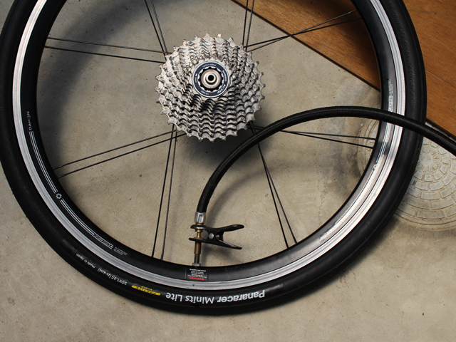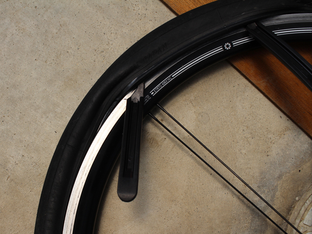| 新しいタイヤにチューブを入れて、リムにはめ込みます。 タイヤを外すときは一苦労ですが、はめ込むのは意外と簡単でした。 |