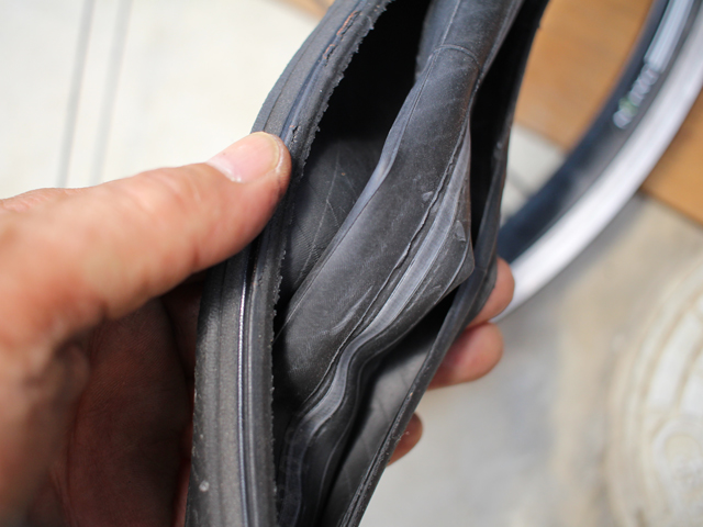 | タイヤからチューブを取り出します。 タイヤの裏側にべったりとくっついていたので、剥がすとき少し緊張しました。 |