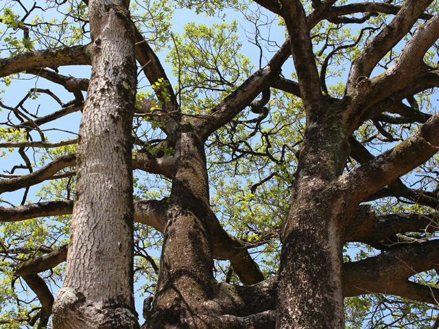 | 近くから木を見上げてみました。(2016年5月5日撮影) 昔はもっと艶があってすべすべの肌だったのに、今は皮膚がかさかさでしみ(苔)もいっぱいできてました。って、まるで自分のことをいっているみたいで可笑しかったです。 |