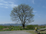 | 去年の今頃、ある一本の木と出会った。春の陽気に誘われて、サイクリングをしていたときのことだ。菜の花が咲き誇る、川沿いの道にその木はあった。僕は思わず自転車を止め、しばし見入ってしまいました。 「うん、なんて美しい姿なんだろう」 まわりに人家はなく、ひっそりとたたずむその姿が、美しさをより神秘的なものにしていると思えた。と、感動するのは僕だけだろうか・・・とにかく、全体の形がすごくいいのだ。ちょうど新芽が吹き出た頃で、枝ぶりがよくわかった。幹から枝にかけて描いている線は、まるで動脈から毛細血管にかけての血液の流れのようにも見える。そう、生命を感じるのだ。 何という木なのかはわからない。名前はどうでもよかった。そして、ごく自然に、僕は持っていたカメラで撮影したのだった。 「よし、ときどきこの木に会いに来よう」 二週間ほど経つと、鮮やかな新緑の姿に変わっていた。 「おおっ、もうこんなに葉がついているのか。それにしても、やっぱり美しい」 その後、約3ヶ月の期間はその木を見ていない。忘れていたのである。 「あ、そうだ、あの木に会いに行かなくちゃ」 思い出したのは、真夏が過ぎようとするお盆の頃だった。久しぶりに見たその木は、両手をいっぱいに広げて、燦々と降り注ぐ陽光を浴びていました。 秋になると、ところどころの葉が茶色になっていた。人が中年になって、白髪を気にするのと似たような感じかな・・・ で、よく見ると、少し実がなっていた。 「あれ、なんだ、柿の木だったのか」 秋も深まり、肌寒い頃になると、葉よりも実のほうが目立つようになってきた。でも、とても食えるような実じゃなかったなあ。もしかしたら、柿の仲間の「猿食わず」という木かもしれない。(たぶん・・・) そして冬になり、残り少ない実も支えきれなくなって、とうとう幹と枝だけの姿に戻ってしまった。こうして僕は、この木とともに四季の移り変わりを感じたのだった。 とても感謝している。「一年間、ありがとう」 ところが、である。この春に見に行くと、姿が少し変わってしまっていた。道に向かって延びていた枝が切り取られていたのである。人々の通行の邪魔になっていたから、仕方がないのかもしれない。この世では、風雪に耐える木よりも、ぬくぬくと暮らす人間さまのほうが偉いのだ。(なんか変?) 「バランスのとれた美しい姿じゃなくなったけど、今年もがんばろうな」 この木の物語を、大きい写真(9枚)で見る |