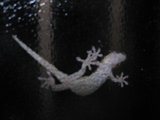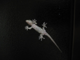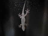 | 夏の暑い季節になった。我が家では5年くらい前から、夜になると台所の窓に、ときどきヤモリがやって来る。窓の外側に張り付いて、台所の明かりに誘われた虫を食べるのだ。ヤモリを見て不快に思う方もいらっしゃるようだが、なかなかどうして、人に害は与えないし、よく見ると可愛らしい生き物である。それに、昔から「家にヤモリがいると縁起がいい」とされているではありませんか。 先日のことである。夕食を終え、ほろ酔い気分に浸っていたとき、台所の窓に、まず古参のヤモ君(オス)がやって来た。動きが止まった。抜き足、差し足・・・、タタタっ、パクっ。どうやら食事が始まったようだ。このヤモ君のことは、以前に書いたことがある。(2011.09.17